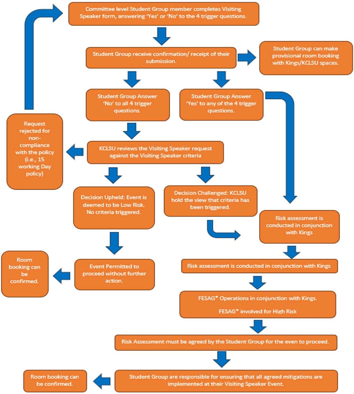 - After considering potential risks posed by the speaker, affiliated organisations and topic for discussion at the event, the KCLSU Governance Department who manage the Visiting Speaker processes will make one of the following recommendations: