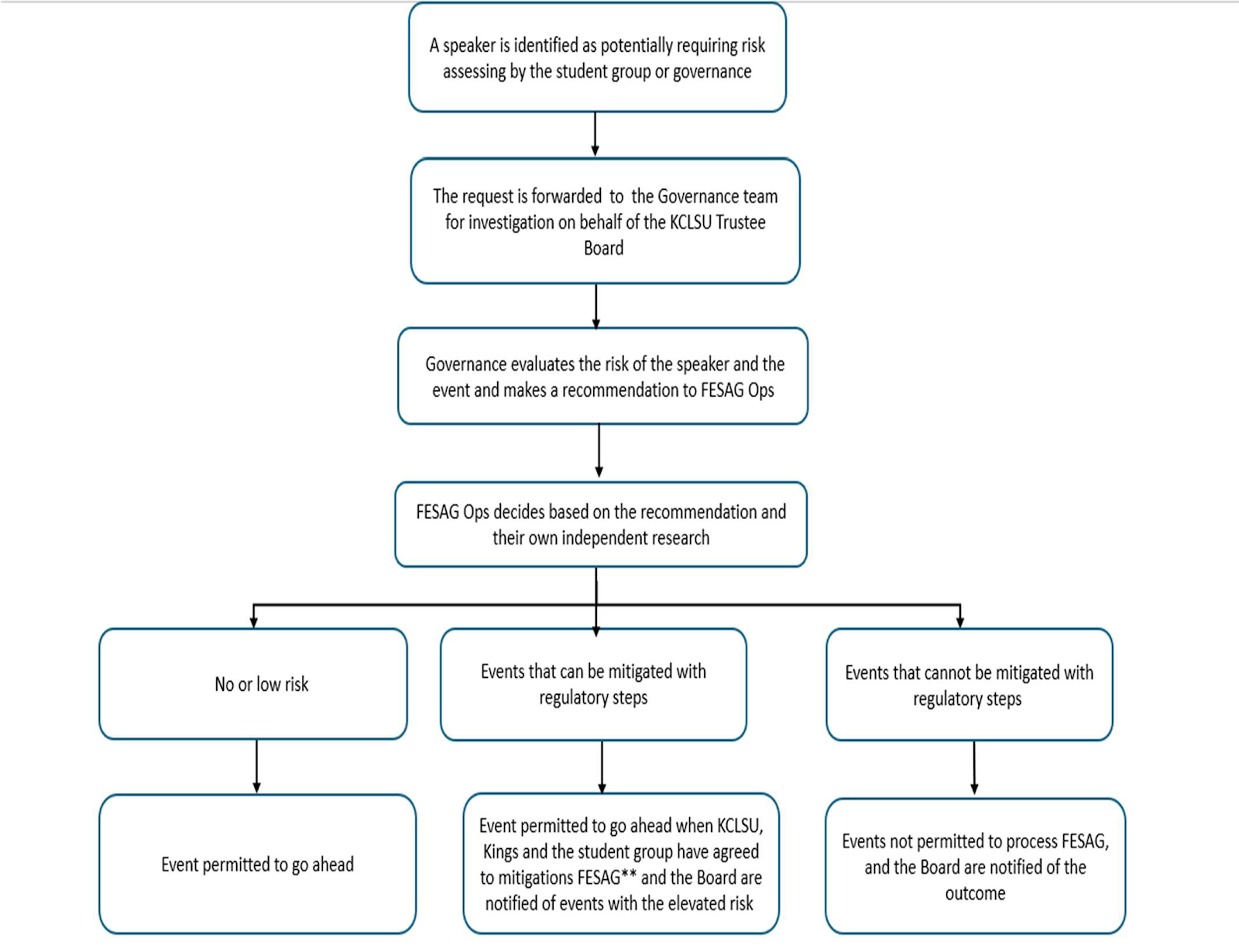 - Decisions related to speakers assessed as high or unknown risk, may be escalated to the KCLSU Trustee Board and are reported to FESAG. Where the KCLSU Board disagree with a decision, they may use their powers to review the decision.